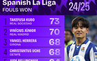 73次,久保建英是本赛季西甲被侵犯次数最多的球员