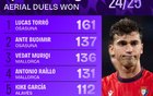 161次,托罗是本赛季西甲赢得争顶最多的球员